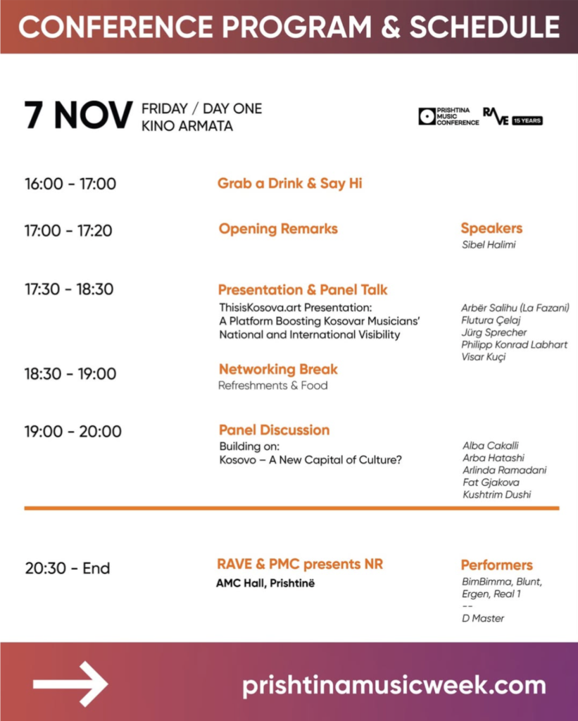 Am 7. November wurde die Plattform bei der Prishtina Music Conference der Öffentlichkeit vorgestellt. Unsere Projektmanagerin Flutura Çelaj präsentierte die Plattform einem großen Publikum, darunter Vertreterinnen und Vertreter der Musikszene, von Botschaften, der Regierung und den Medien. Zu den Gastrednern gehörten der Schweizer Botschafter Jürg Sprecher, Better-Together-Gründer und CEO Philipp Konrad Labhart sowie zwei etablierte kosovarische Musiker, Visar Kuçi und Arber Salihu.